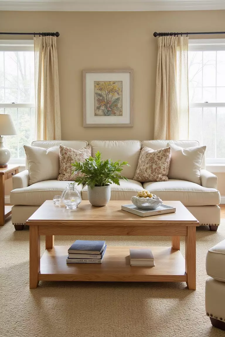 The natural grain and warmth of wood provide a lovely contrast to the soft beige.
