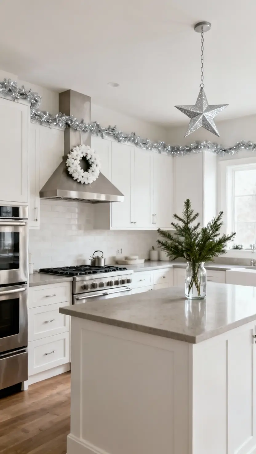 Drape a delicate silver garland around your white cabinet edges, giving a restrained, elegant shimmer.