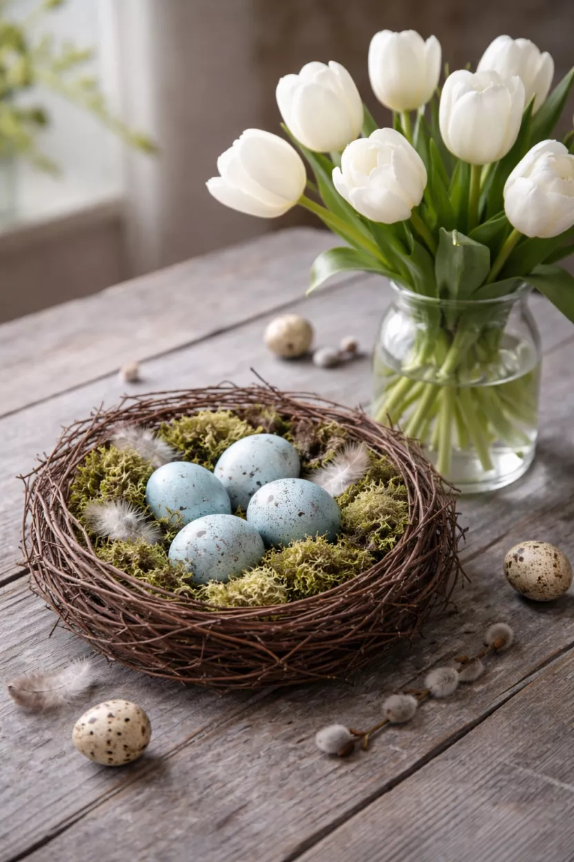 Placing speckled blue eggs in the center creates a focal point that screams spring without shouting.