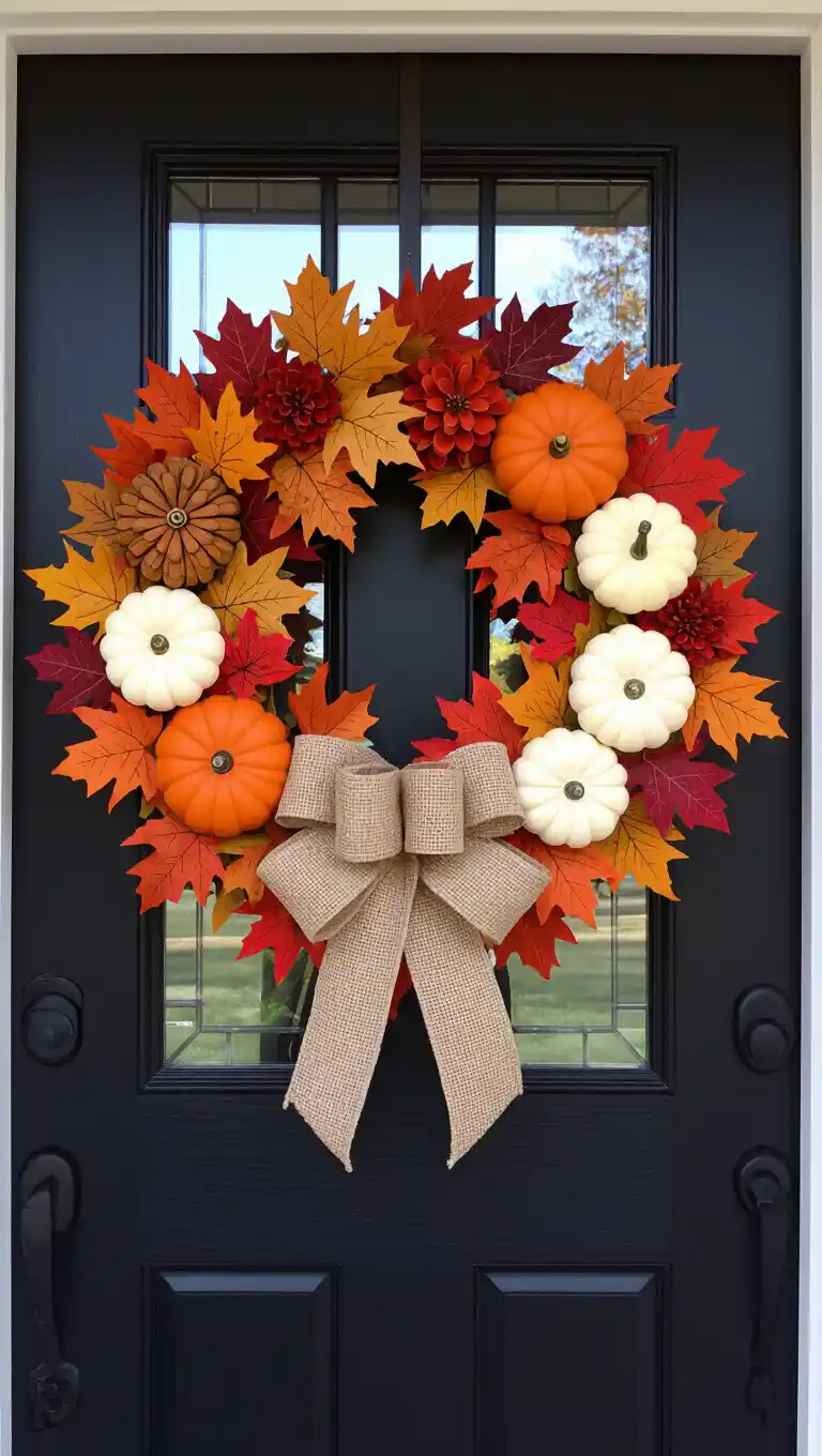 Imagine a beautiful, light-colored wreath, maybe with some white pumpkins nestled among delicate autumn leaves.