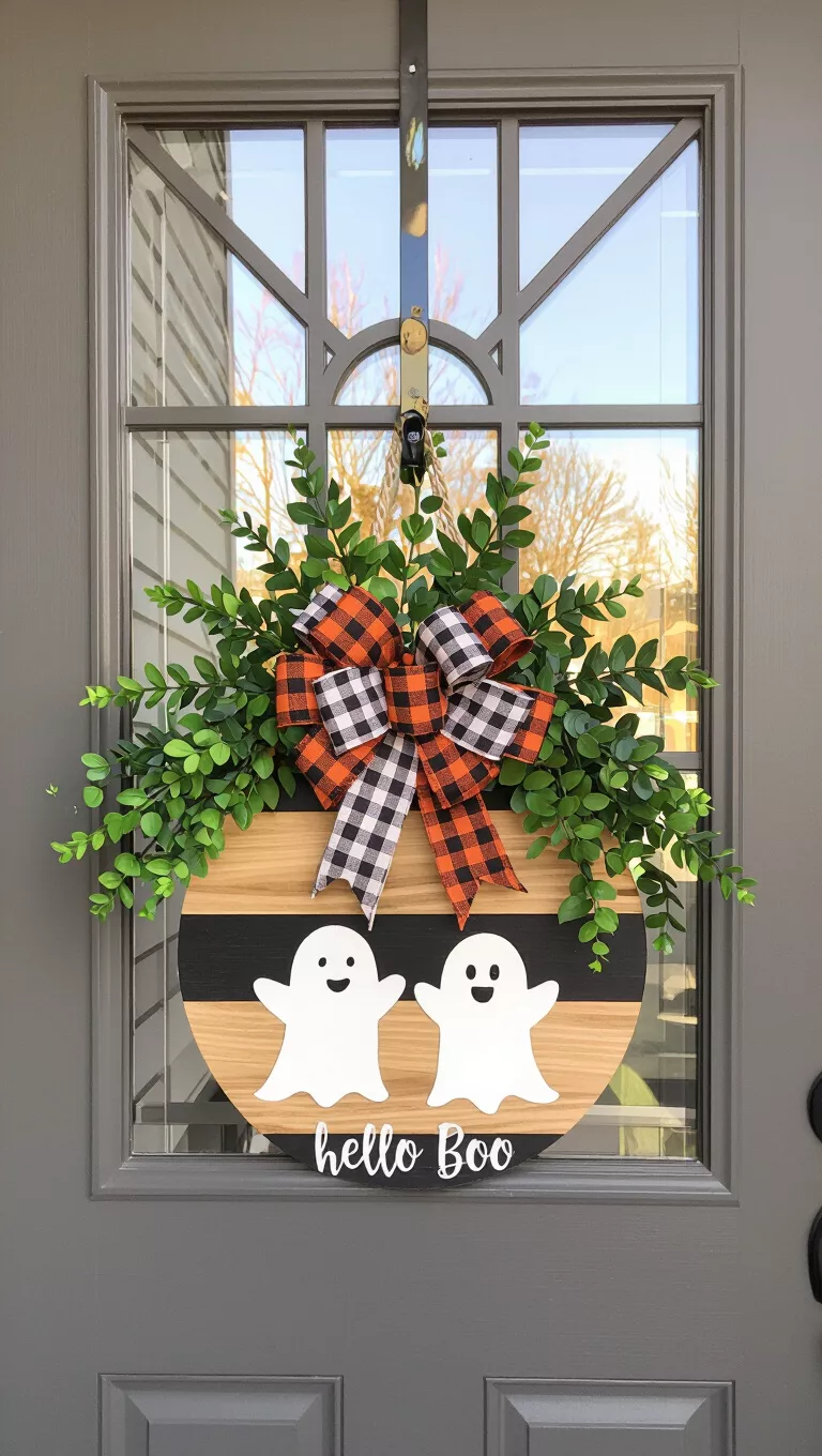 The green foliage and that plaid bow with ghost patterns on top really tie everything together, giving it that perfect spooky yet welcoming vibe.