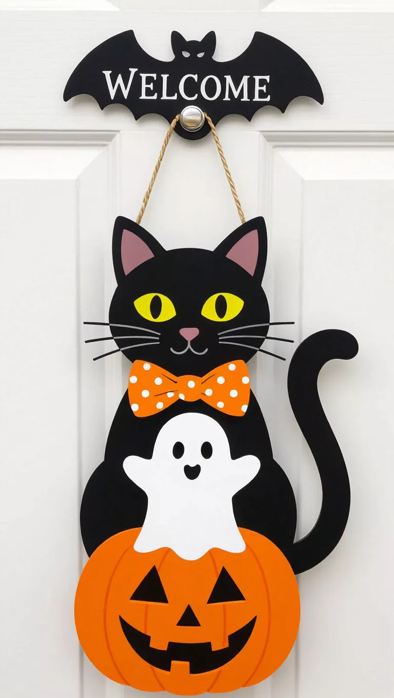 This door hanger features a classic black cat with glowing yellow eyes, a genuinely smiling orange jack-o’-lantern, and a friendly white ghost.