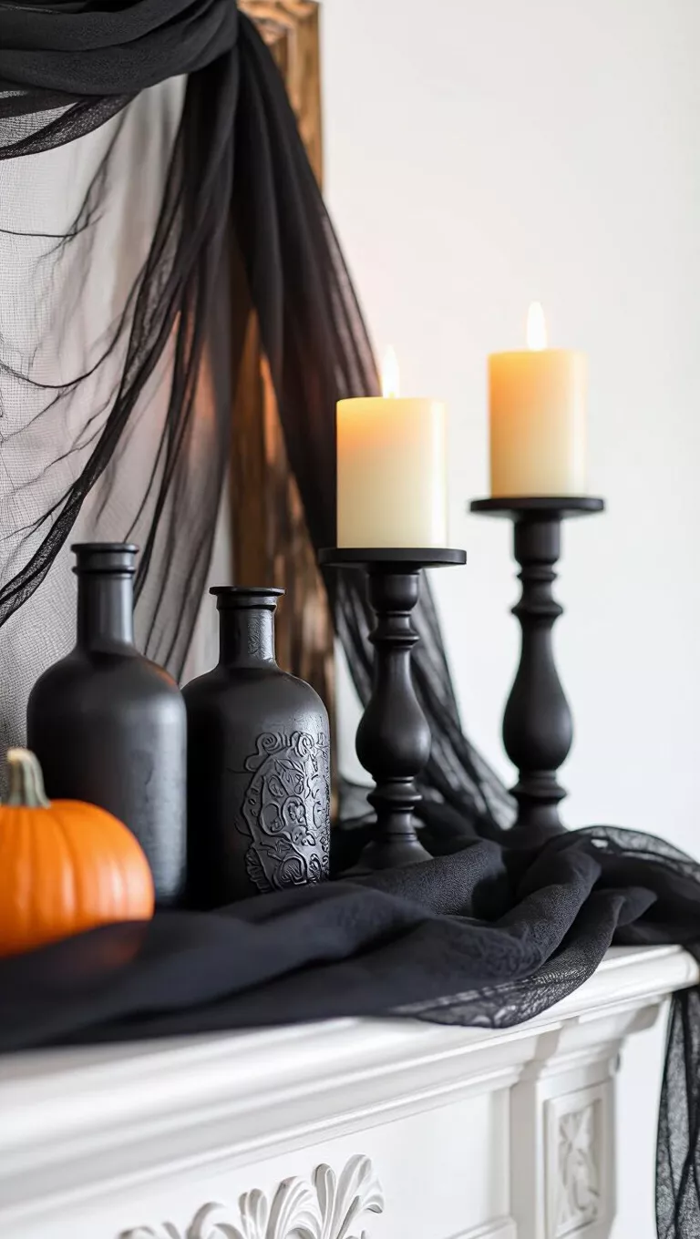 Drape some black creepy cloth over the mantel for that instant haunted vibe.