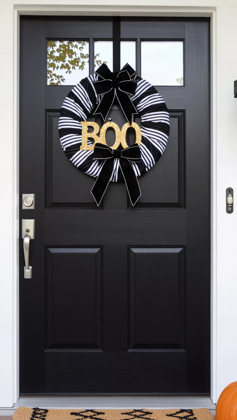 For a truly chic entrance, stack three black pumpkins each embellished with silver glitter ‘BOO’ letters.