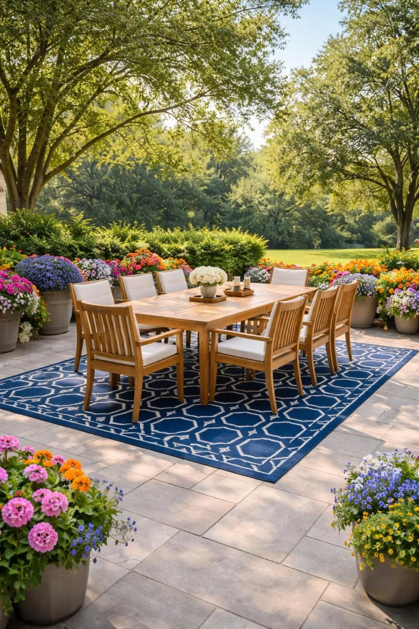 You can instantly change the mood of your backyard by tossing down a large rug to anchor your furniture.