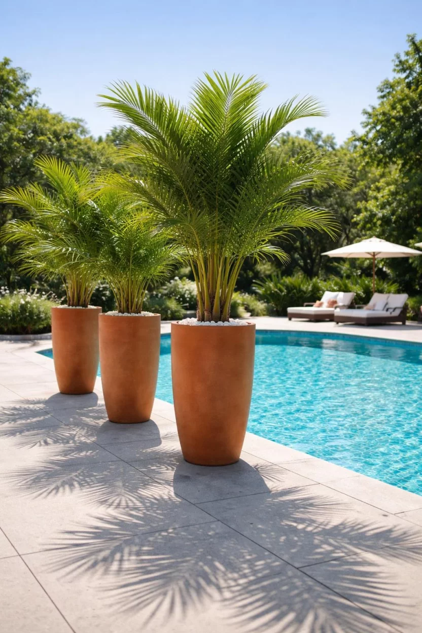 Select hardy palms or architectural grasses to add a splash of greenery without the constant maintenance of a botanical garden.