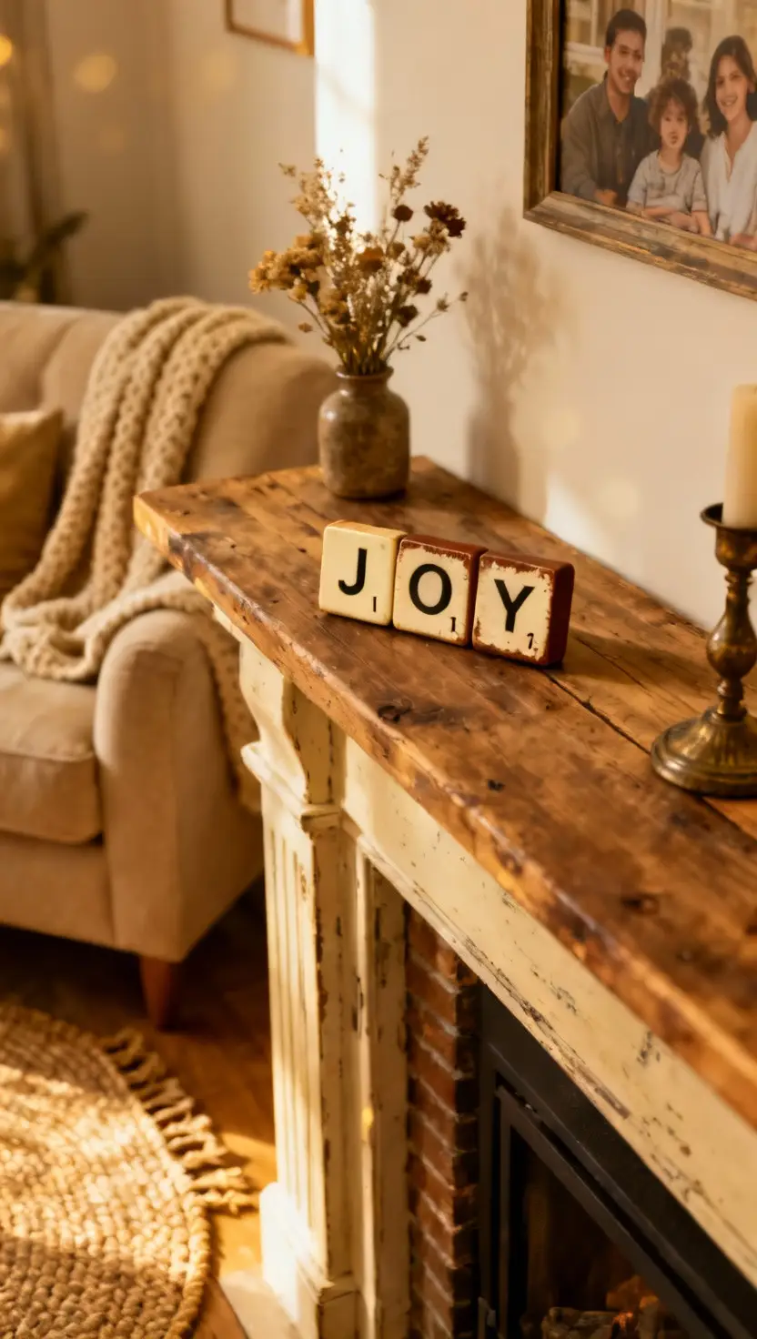 Imagine a cozy living room with the word ‘JOY’ spelled out in rustic, wooden tiles among some pine boughs.
