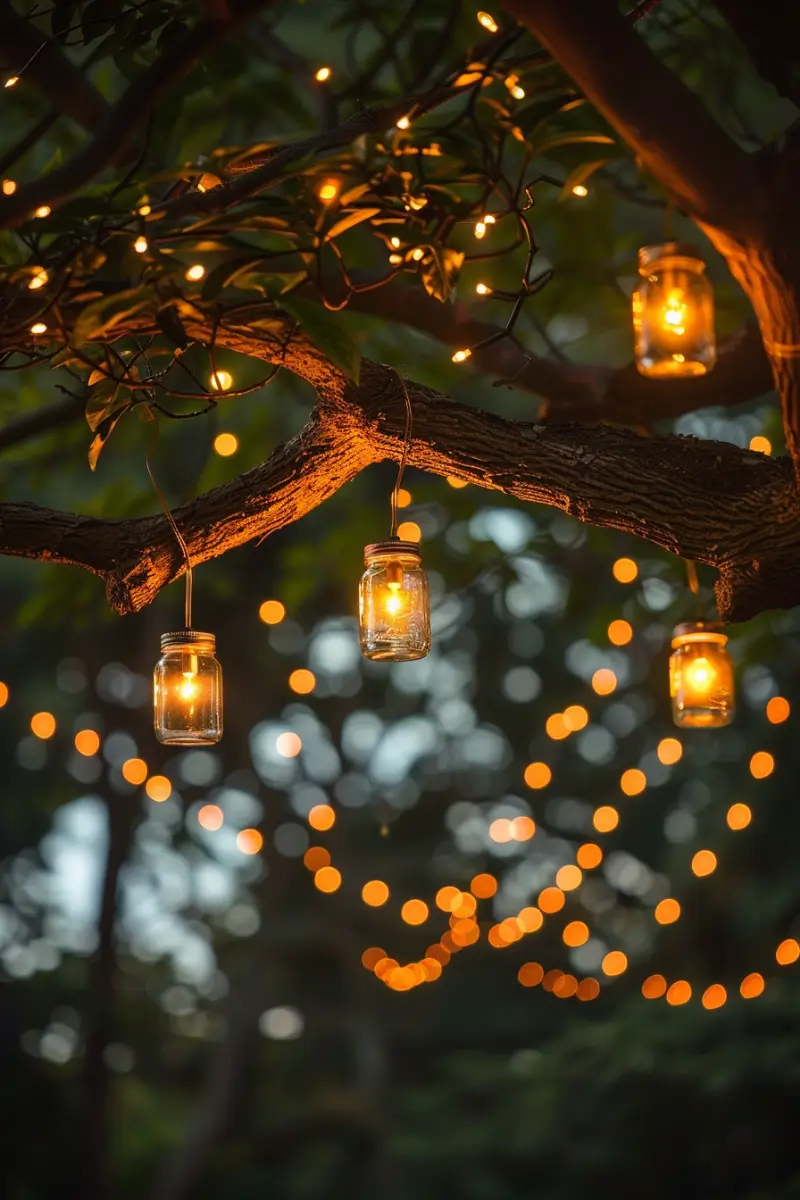 Add a touch of magic to your garden with mason jar lights hanging from tree branches. Complement them with string lights to create a warm and inviting atmosphere.