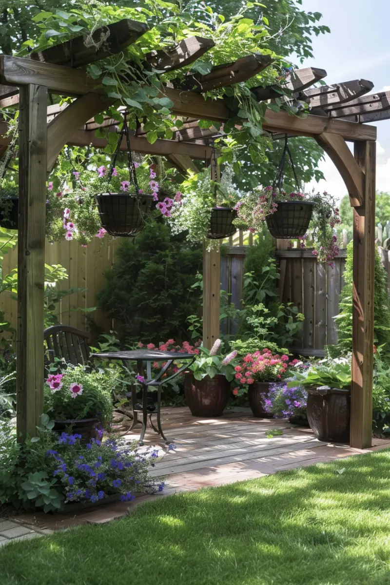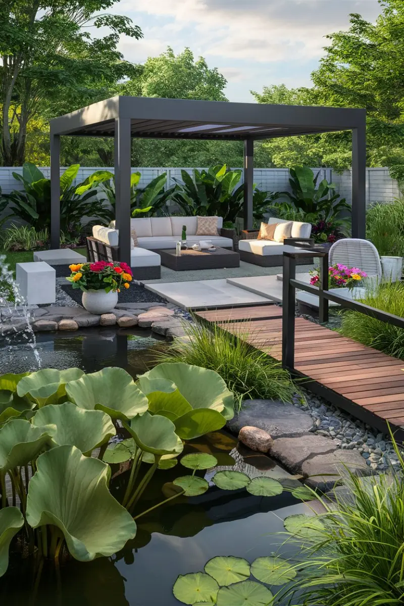 Transform your backyard into a luxurious retreat with a modern pergola and cozy seating area. Surround the space with lush greenery, a tranquil pond, and a wooden walkway. Enhance the ambiance with stylish furniture and vibrant flowers for the ultimate outdoor relaxation spot.
