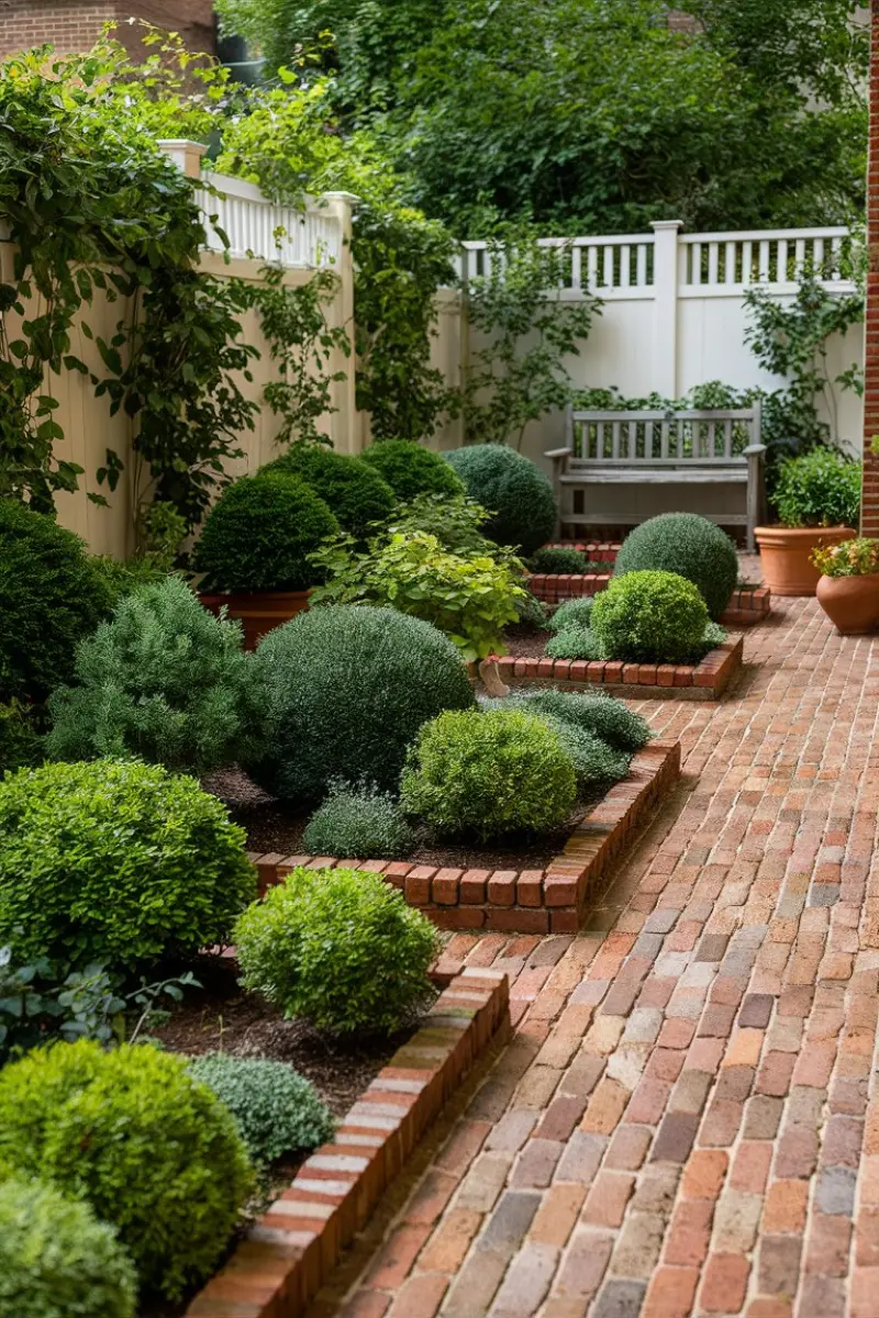 Design a tranquil brick courtyard garden with well-organized plant beds filled with trimmed shrubs and low-growing plants. Include clean brick pathways that lead to a wooden bench for seating.