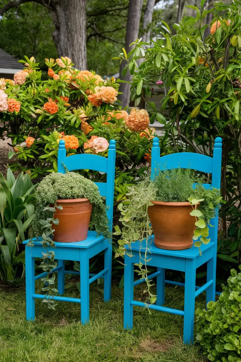 Add a splash of color to your garden with bright furniture. Use painted chairs as plant stands to create a whimsical and vibrant display.