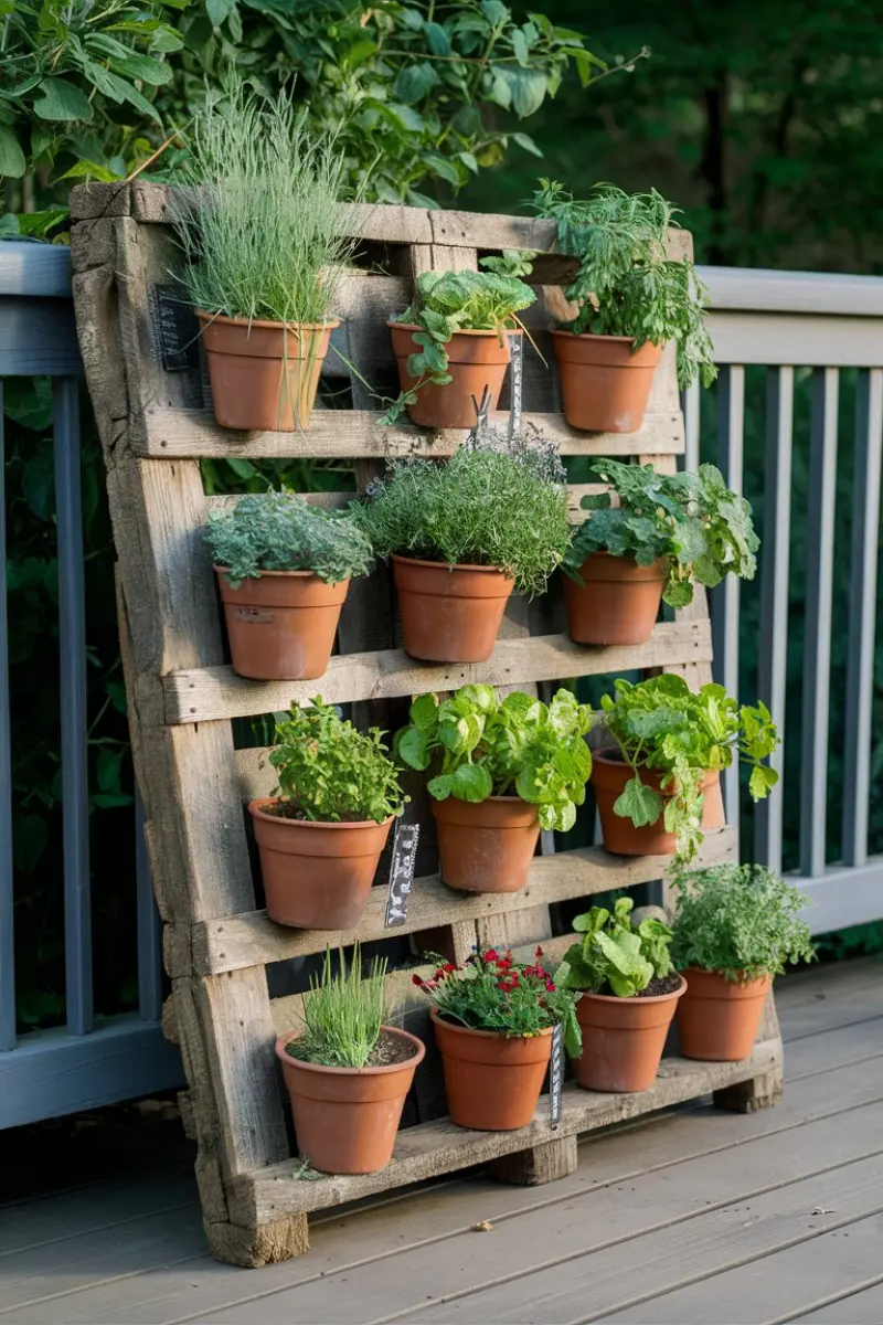 Build a pallet garden by using a weathered wooden pallet to hold terracotta pots filled with herbs and plants.