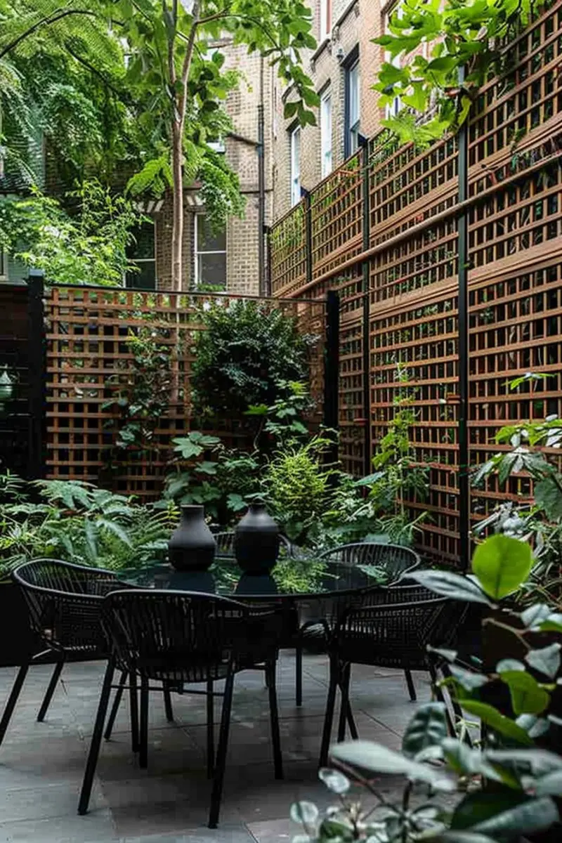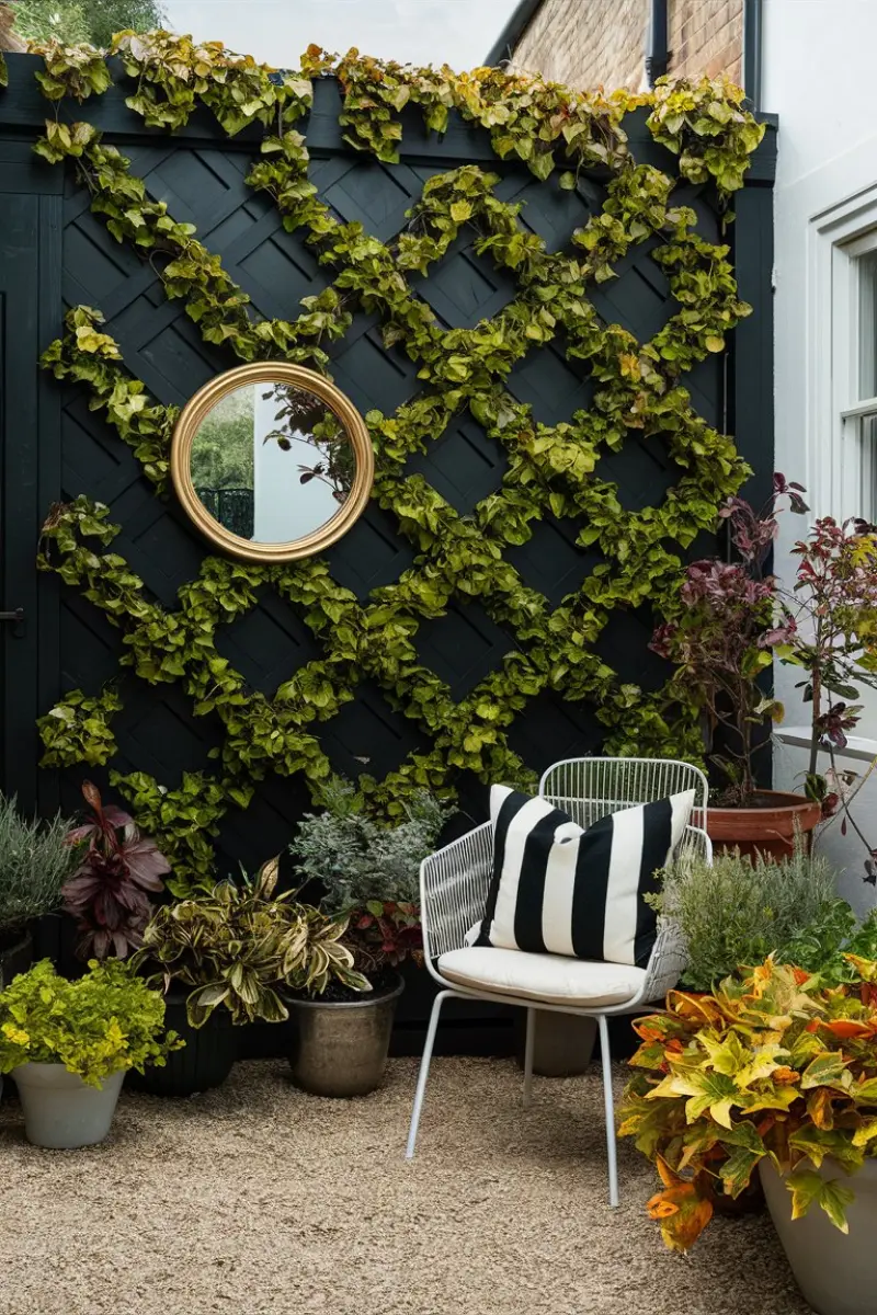Grow a lattice green wall by training ivy to form a diamond pattern on a black wooden fence. Add a decorative round mirror for a unique touch.