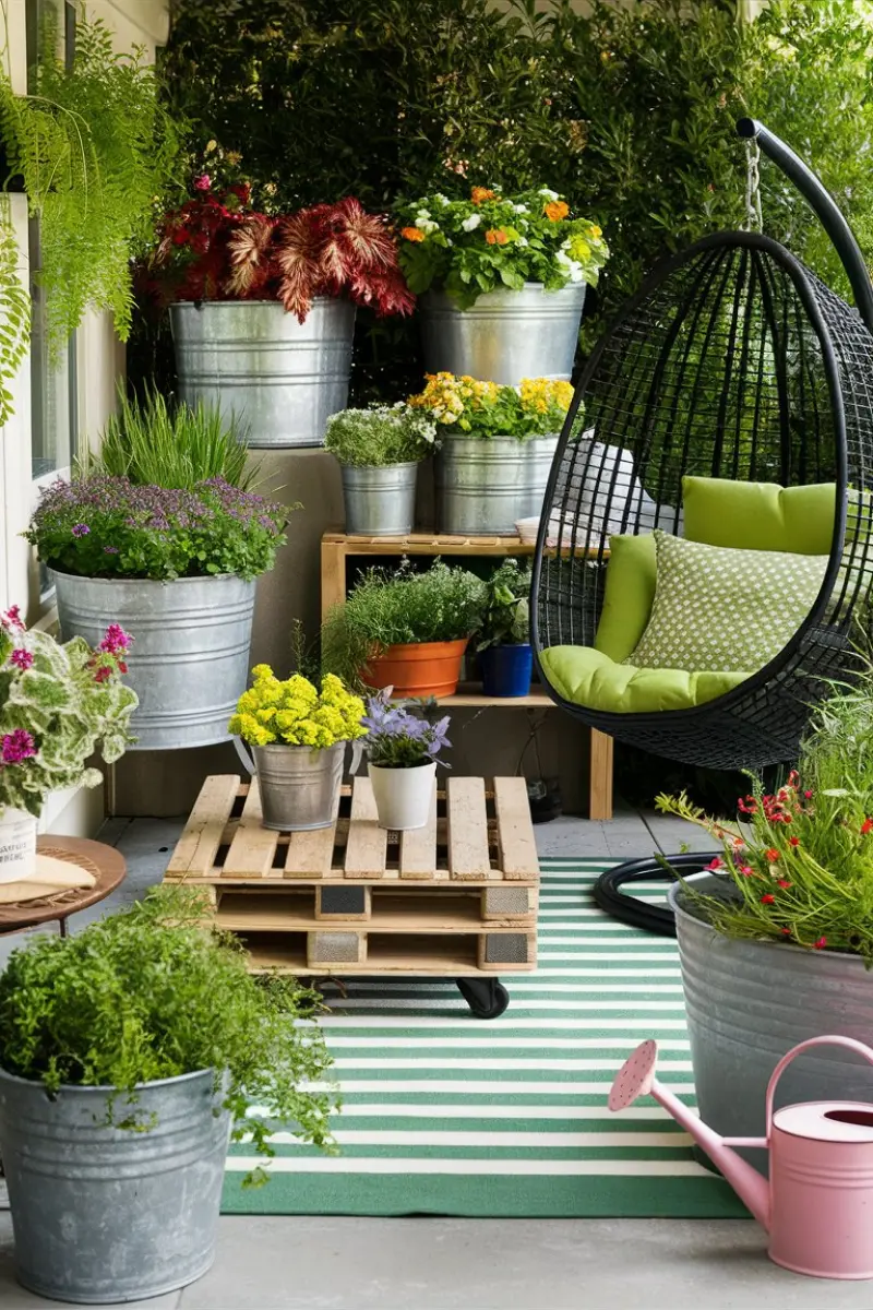 Embrace container gardening on your patio with various metal tubs and pots filled with vibrant plants and herbs.