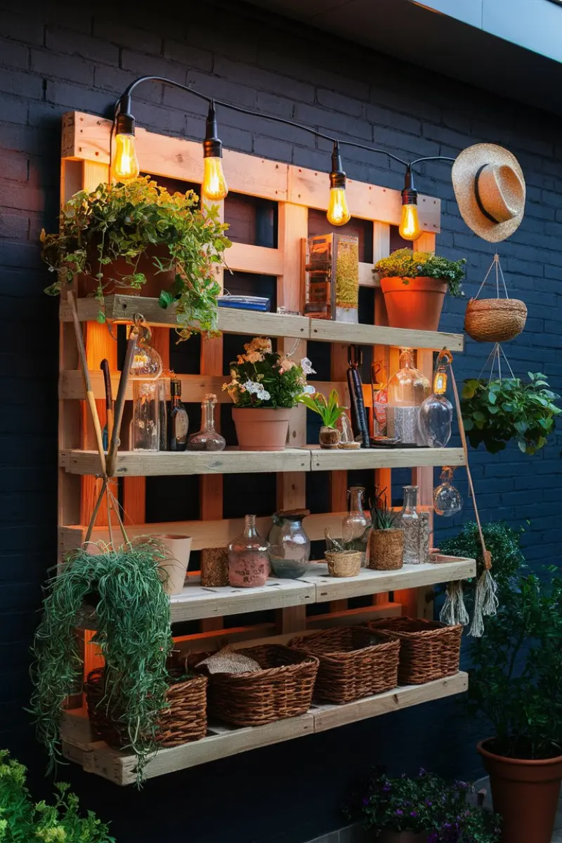 Transform a wooden pallet into a functional and stylish shelving unit. Use it to store and display potted plants, gardening tools, and decorative items. Mount it on a wall for an efficient and rustic addition to your garden.