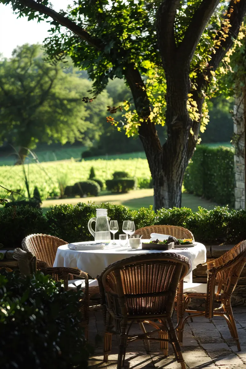 Choose flexible furniture like wicker chairs and a round table for your patio. This setup is perfect for casual meals and gatherings.