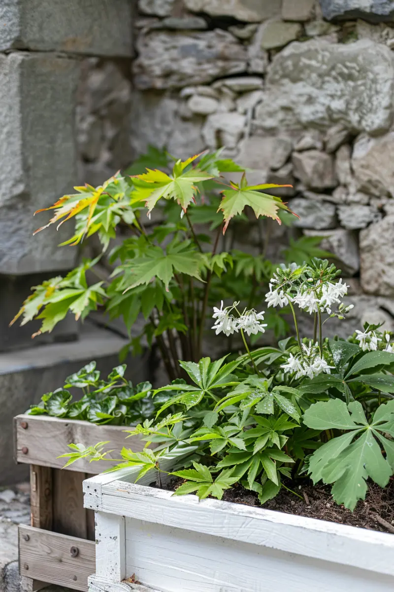 Transform a shady corner with a white planter box filled with various shade-loving plants.