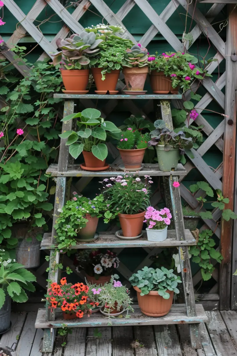 Turn an old step ladder into a unique plant stand. Place potted plants and flowers on each step, creating a vertical garden display. Position it against a lattice fence and surround it with lush greenery for a rustic, charming garden feature.