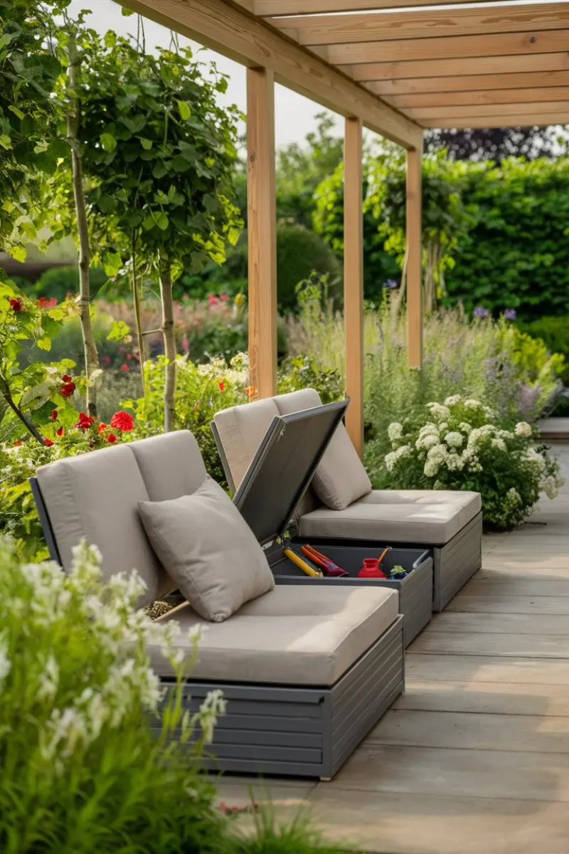 Optimize your garden’s functionality with seating that doubles as storage, providing a practical and stylish solution for a tidy outdoor area.