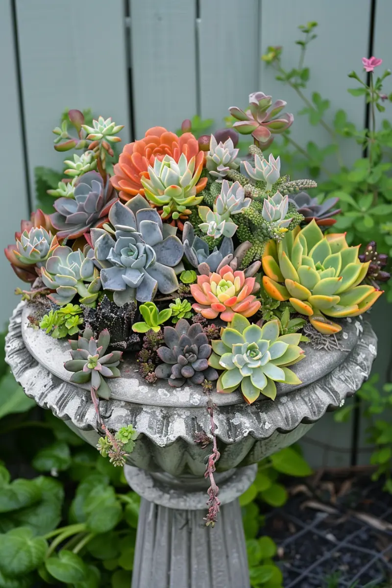 Repurpose an elegant birdbath into a beautiful succulent planter. Fill it with a variety of colorful succulents.