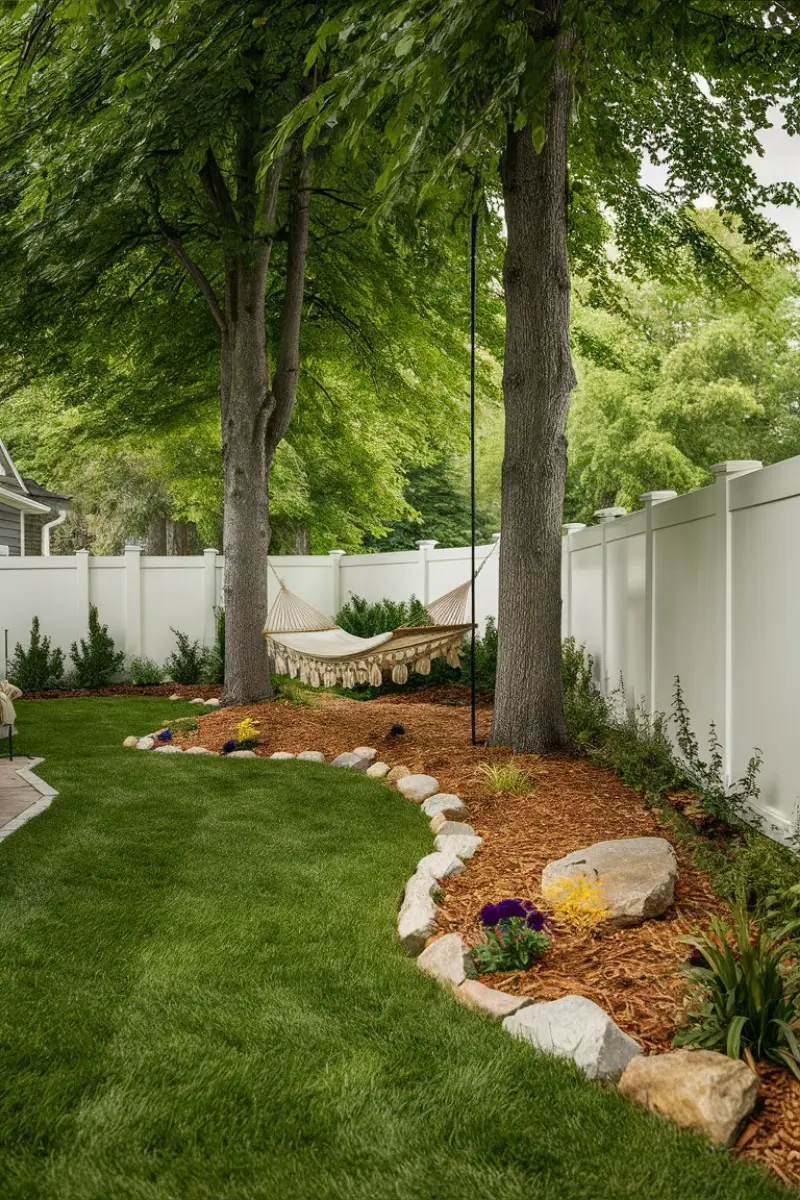 Transform your side yard into a peaceful retreat by adding a hammock between sturdy trees. Keep the grass well-maintained and border it with a garden bed filled with mulch and decorative rocks.