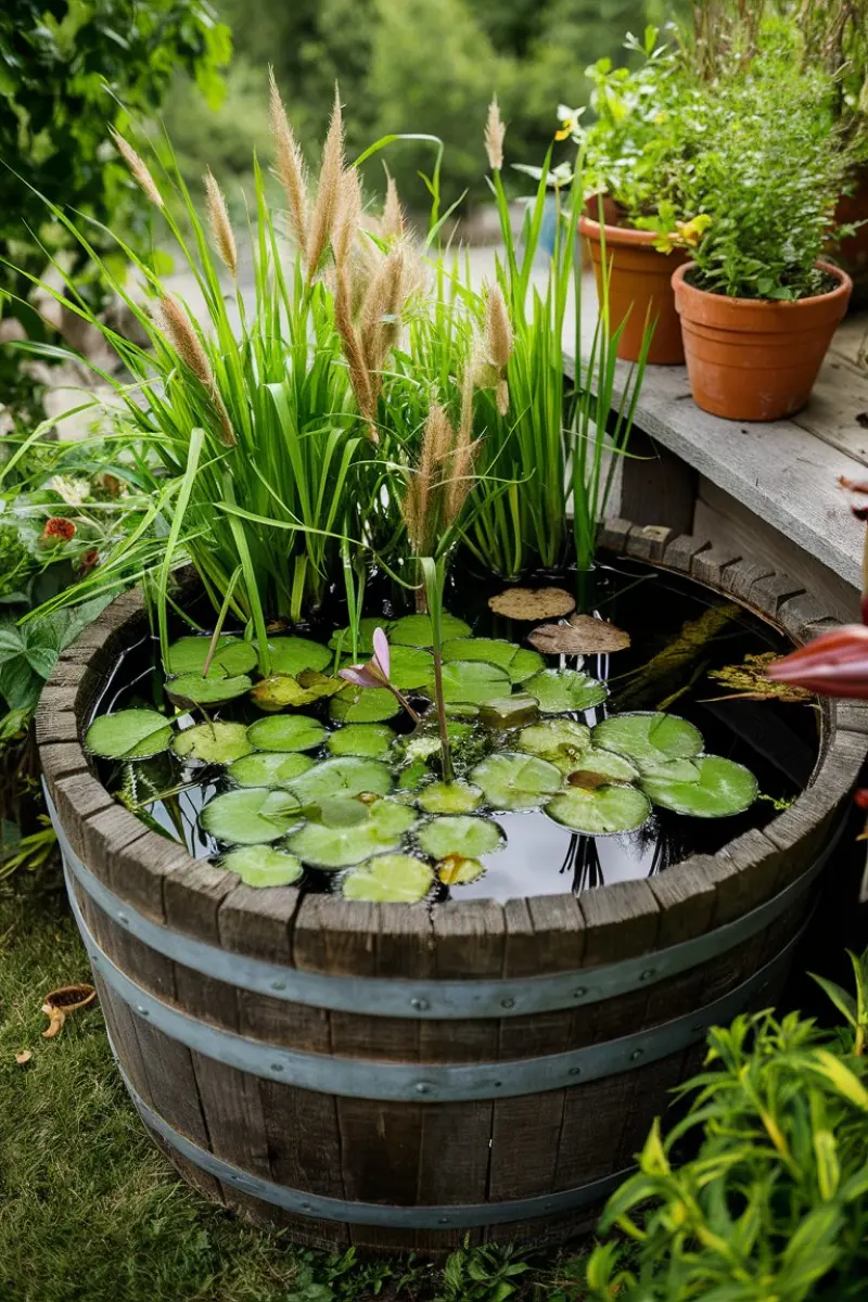 Transform a wooden barrel into a charming pond by filling it with water plants like lilies and tall grasses. Surround the pond with lush greenery and place potted plants nearby for a serene, natural garden feature.