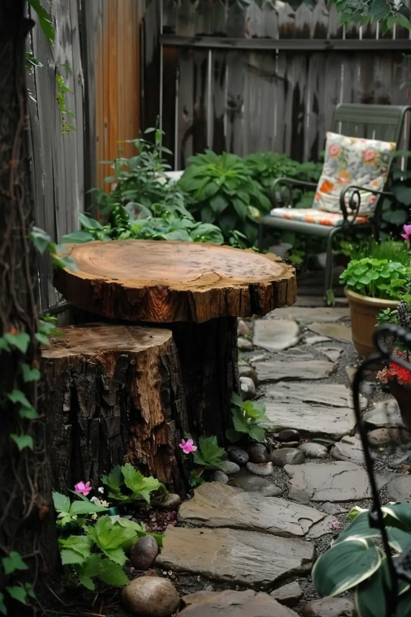 Repurpose a tree stump into a unique garden table by polishing the surface and adding a flat top.