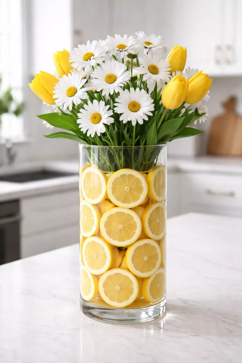 You can slice up some citrus fruits and line the inside of a clear glass vase for an instant pop of color.