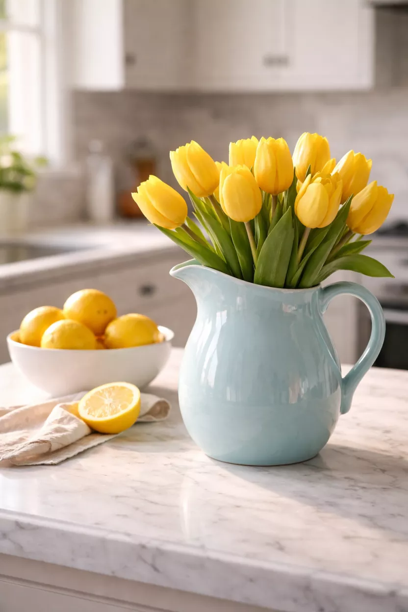 A light blue pitcher serves as a perfect vase for those yellow tulips you bought on impulse.