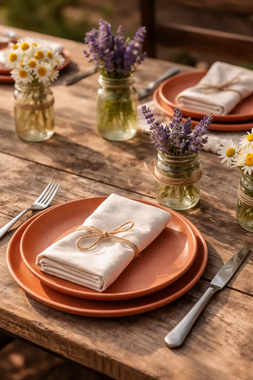 You probably have some old jars sitting in your pantry right now. Wash them out and fill them with flowers you found in the backyard or at the grocery store. Terracotta plates provide a warm vibe that makes everyone feel at home immediately. I think the matte finish on the dishes keeps things from looking too shiny or fake. Stick to cream napkins because they do not distract from the bright floral colors. Twine works great for tying Everything together since it is cheap and looks intentionally rustic. Your guests will definitely ask where you bought the decorations.