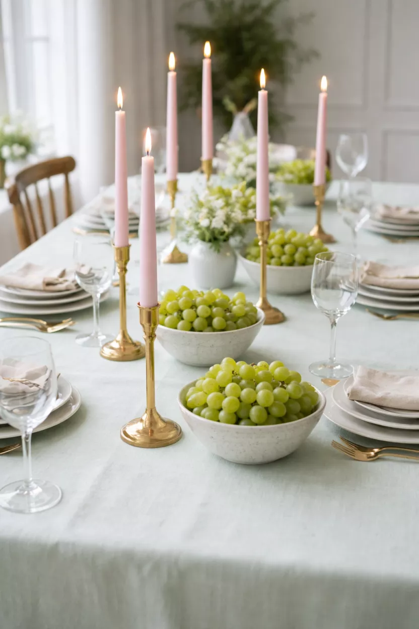 Pastels remain a classic choice for a reason. You can mix mint green and soft pink without making the room look like a nursery. I suggest using brass candle holders to add a little bit of weight and shine to the setup. Tall candles create height so your table does not look flat and boring. If you use speckled ceramics, you add some texture that feels modern for 2026. Put some fruit in the bowls because people like to snack while they wait for the main course. It is a simple trick that fills space.
