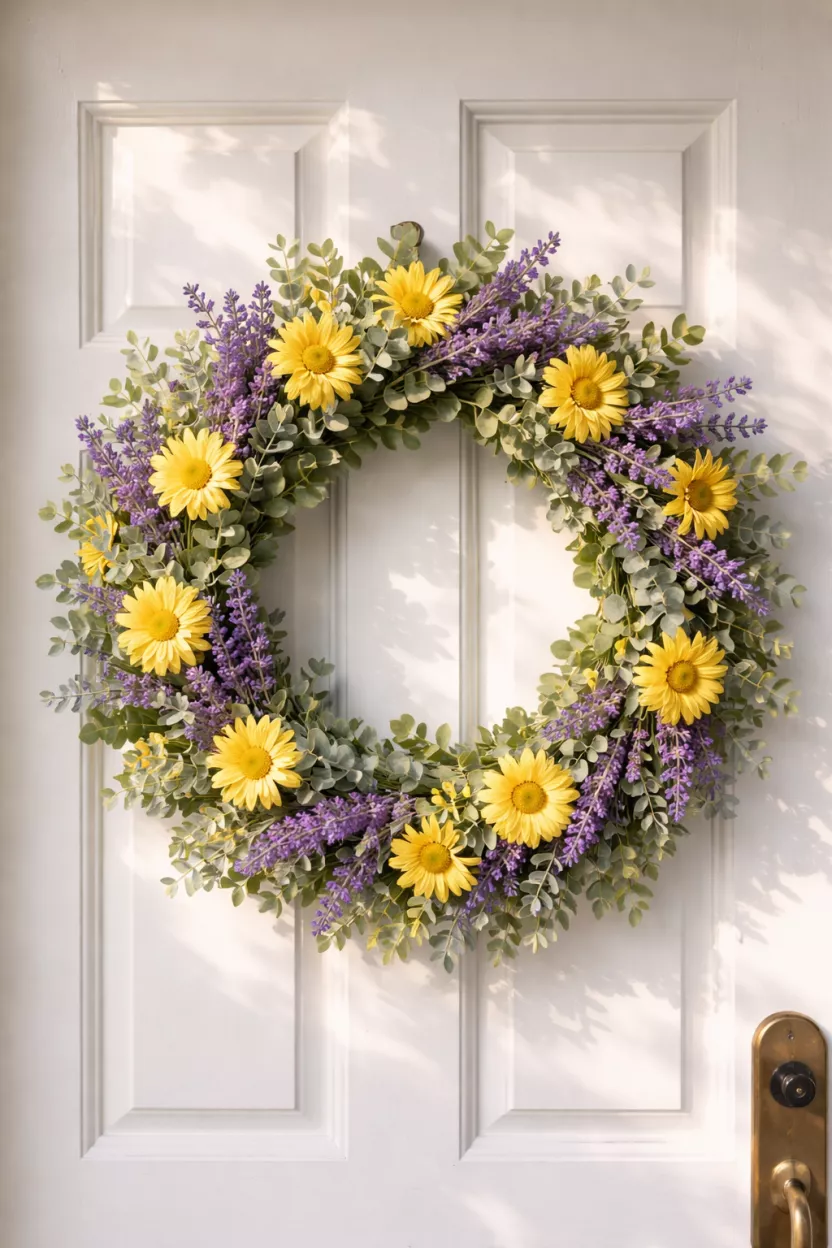 I suggest you mix yellow daisies with some purple lavender to create a high contrast look that pops against a white or light colored door.