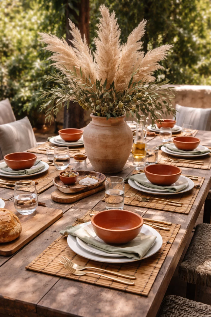 Place handmade burnt orange terracotta bowls at every seat to give the setting a Mediterranean village feel.