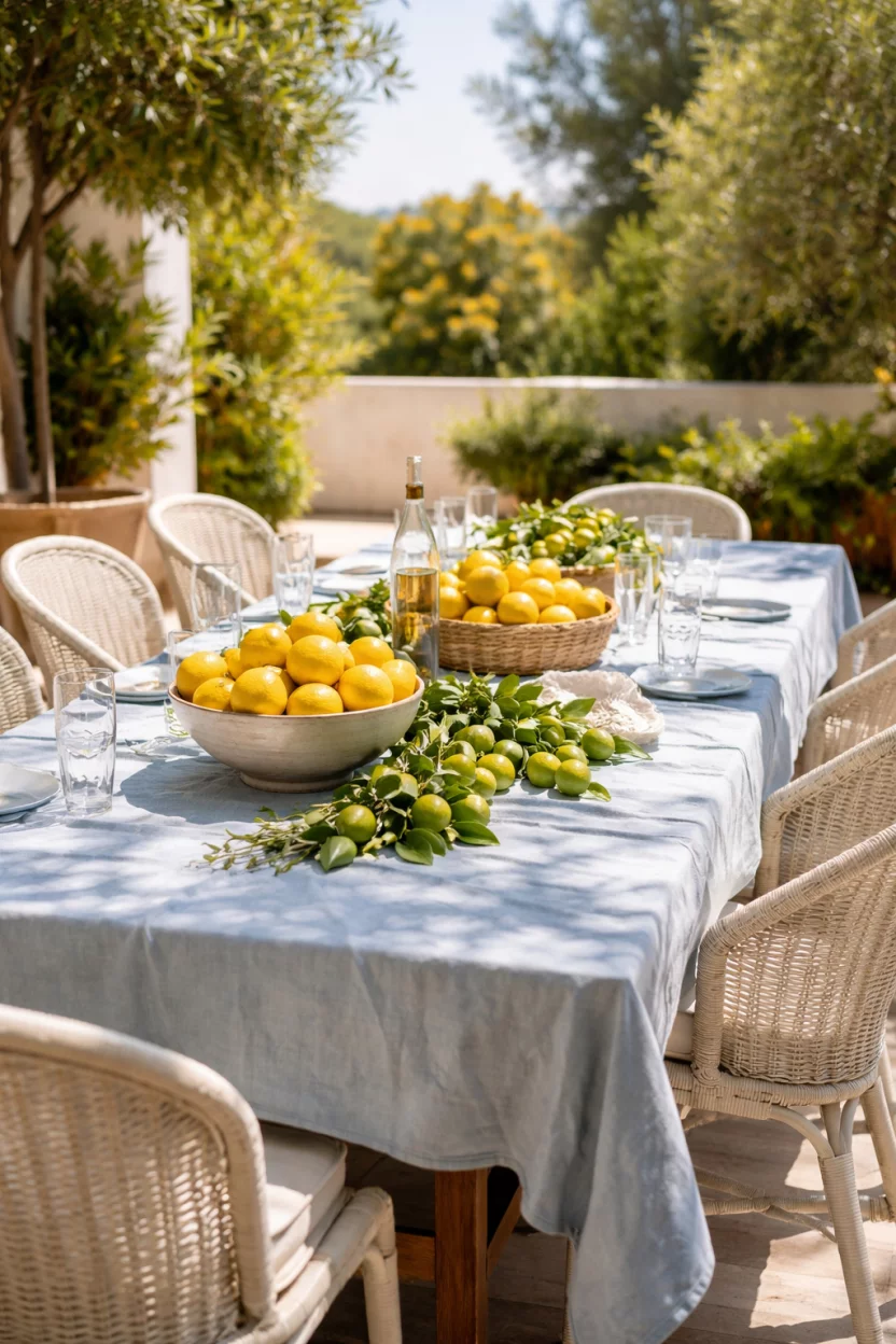 Scatter real lemons and lime branches directly on the fabric for an effortless, organic look.