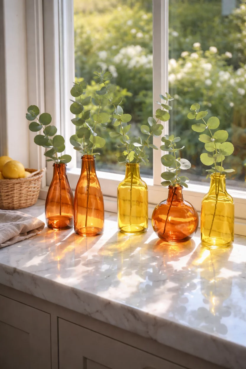 These transparent citrus toned glass vases act like jewelry for your window sills.