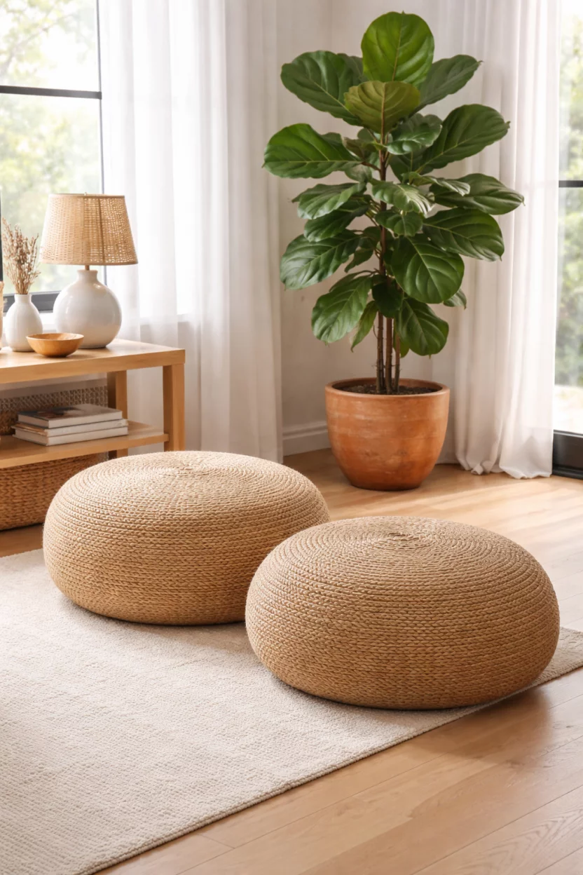 Throwing a few textured oversized jute floor poufs into your living area invites a more relaxed atmosphere.