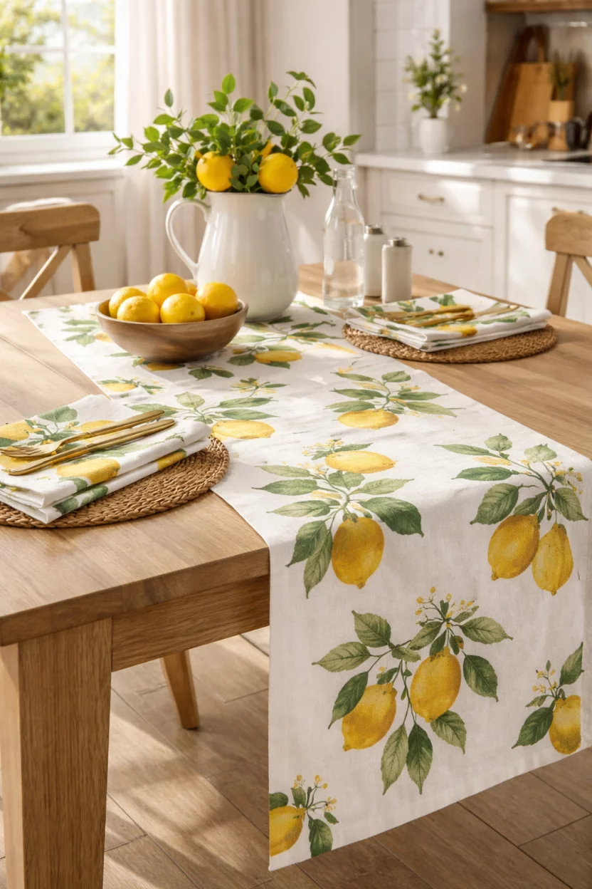 A simple linen runner featuring bold lemon prints instantly shifts the mood from winter gloom to a Capri afternoon.