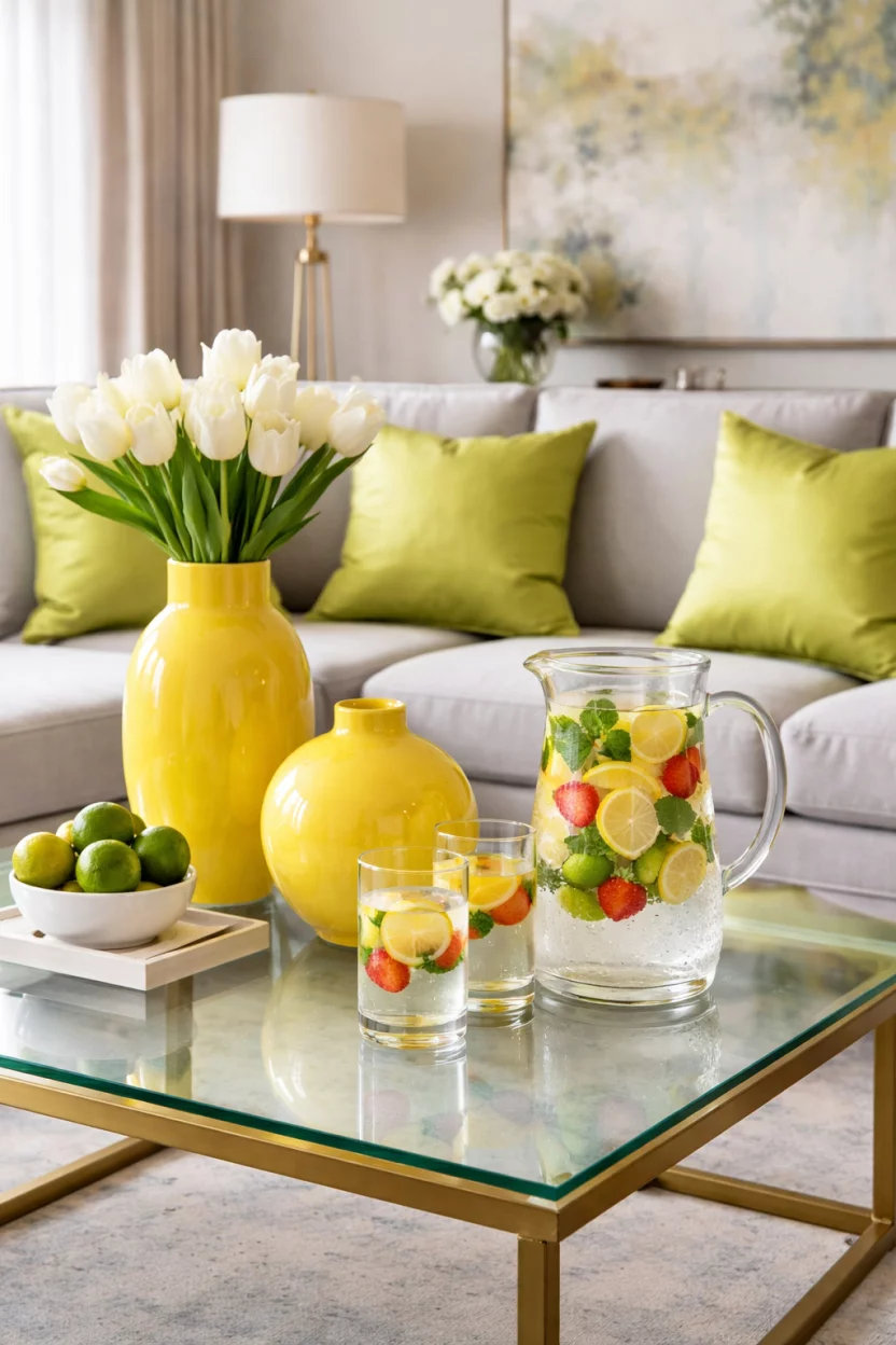 You can inject energy into a neutral room by placing lemon yellow ceramic vases on your central coffee table.