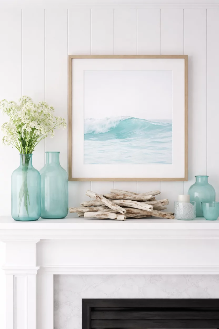 You can gather a collection of large white scallop shells to line the mantel edge for a subtle nod to the beach.