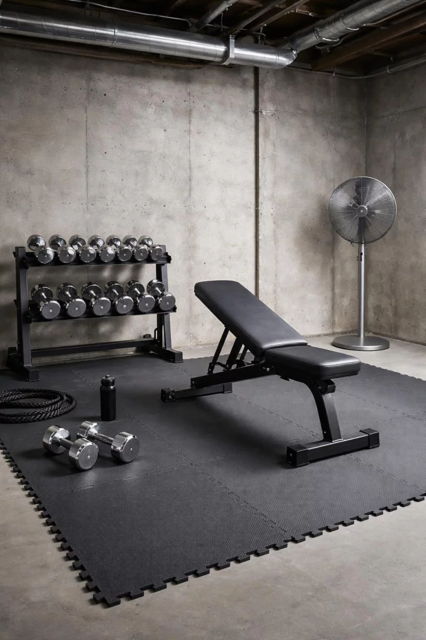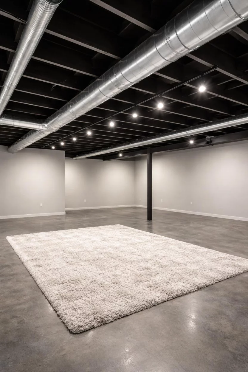 Large, inexpensive rugs are the easiest way to make an unfinished basement feel like a real home.