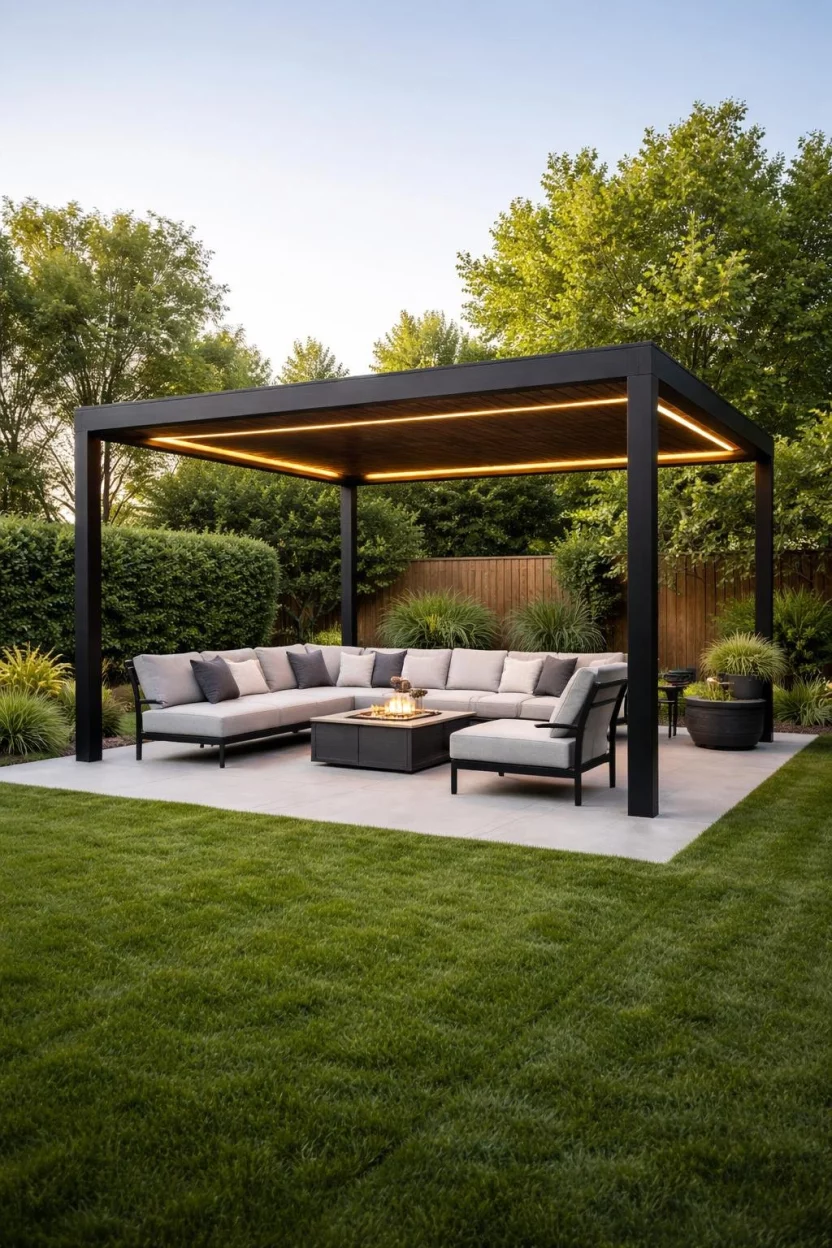 Cozy seating circles under the pergola rafters allow you to enjoy the fire while staying protected from the dew.